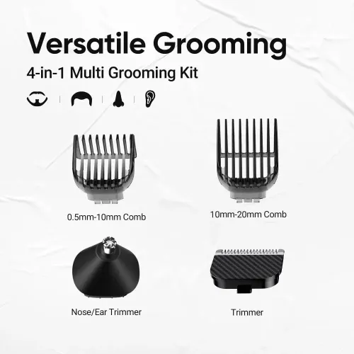 • Attachments: Trimmers for beard, mustache, nose, ear, and fine detailing
