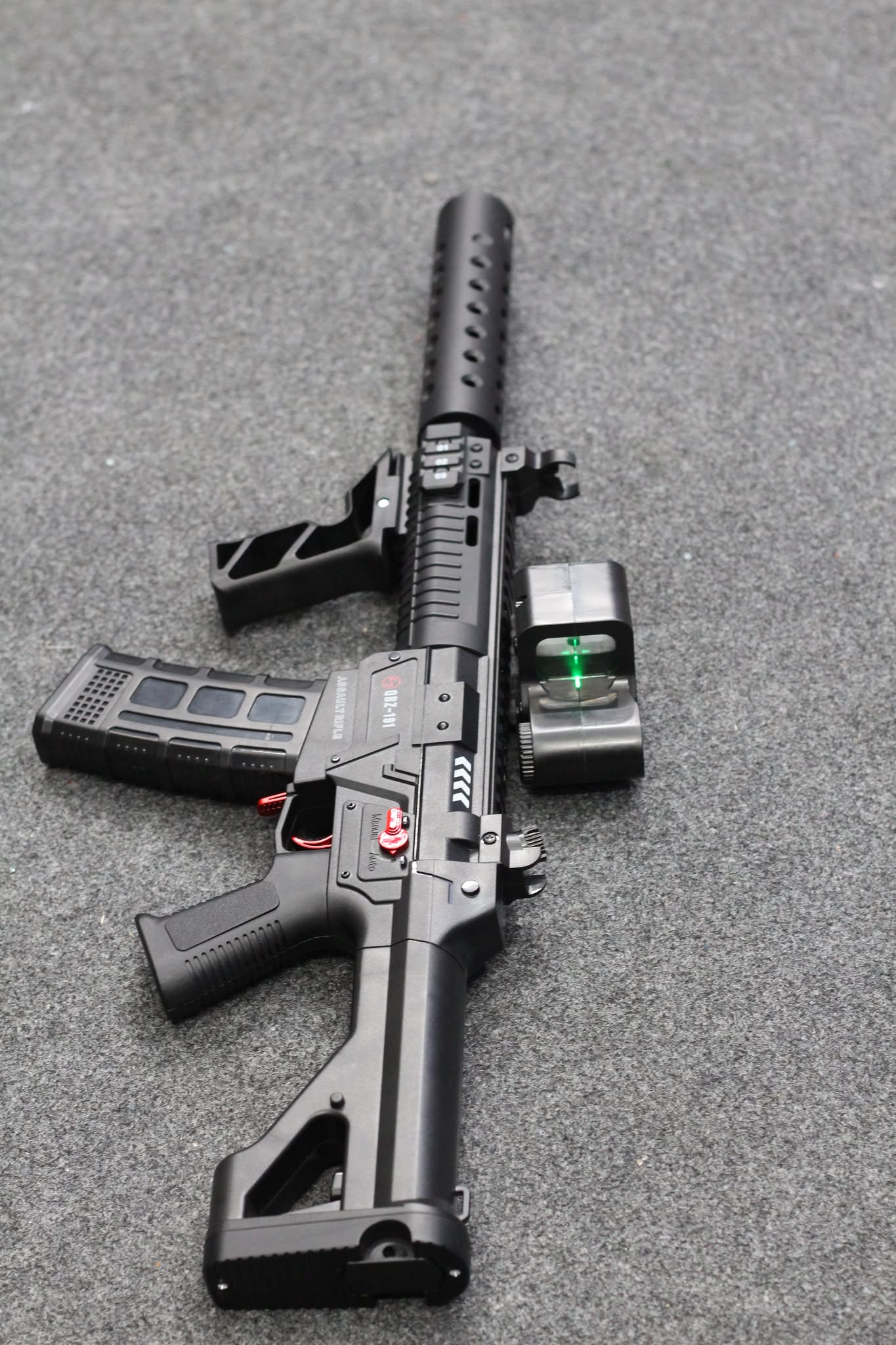 - Tactical Optic & Foregrip: Includes an attachable holographic-style sight and an angled foregrip for maximum control and accuracy.
